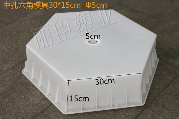 通過采用PP聚丙烯塑料注塑成型的中孔水泥六角磚模具,在后期澆筑水泥制品過程中能較為便利的進行生產,對于在澆筑過程中施工方的野蠻敲打下,中孔六角模具依舊能保持原有的特性。