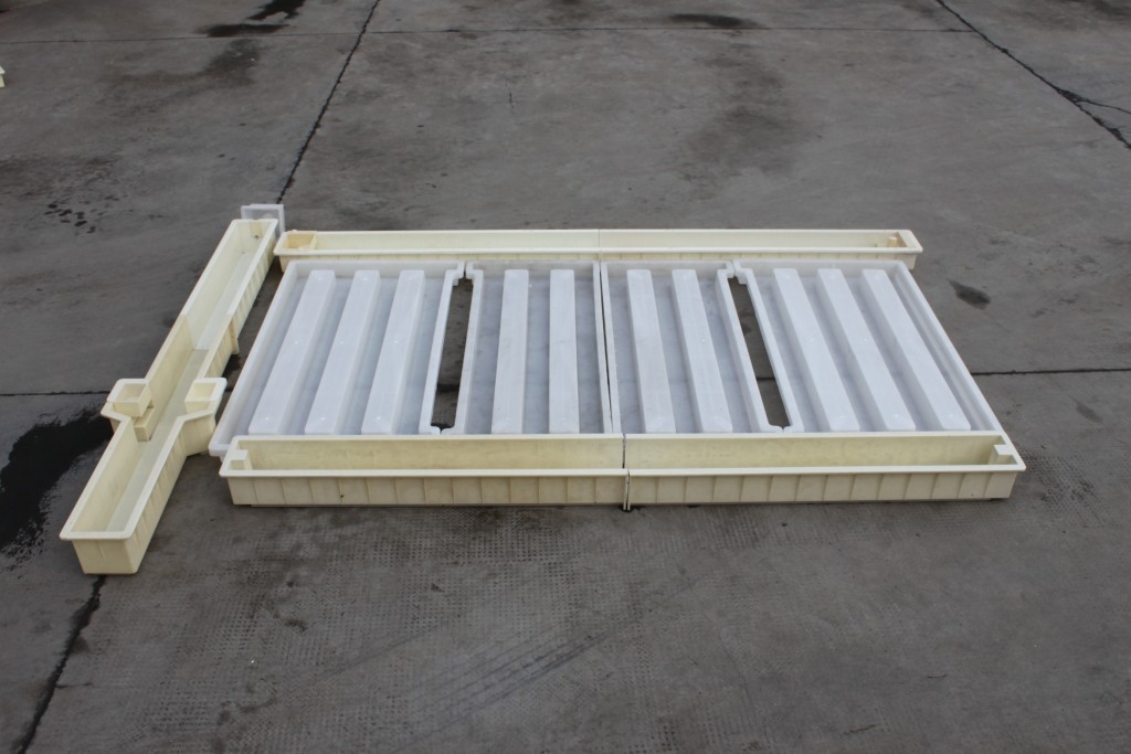 護欄欄片模具在高速路基護欄模具里面設置了4片式設計,水泥欄片成型為4+3+3+4的組合模具,尺寸分別為149.5*81*9cm2片,149.5*59*9cm2片。在使用整個路基護欄模具澆筑水泥制品過程中,水泥欄片模具為使用率相對較高的模具,采用PP聚丙烯原料更好的韌性可以更好的提高模具的使用次數。